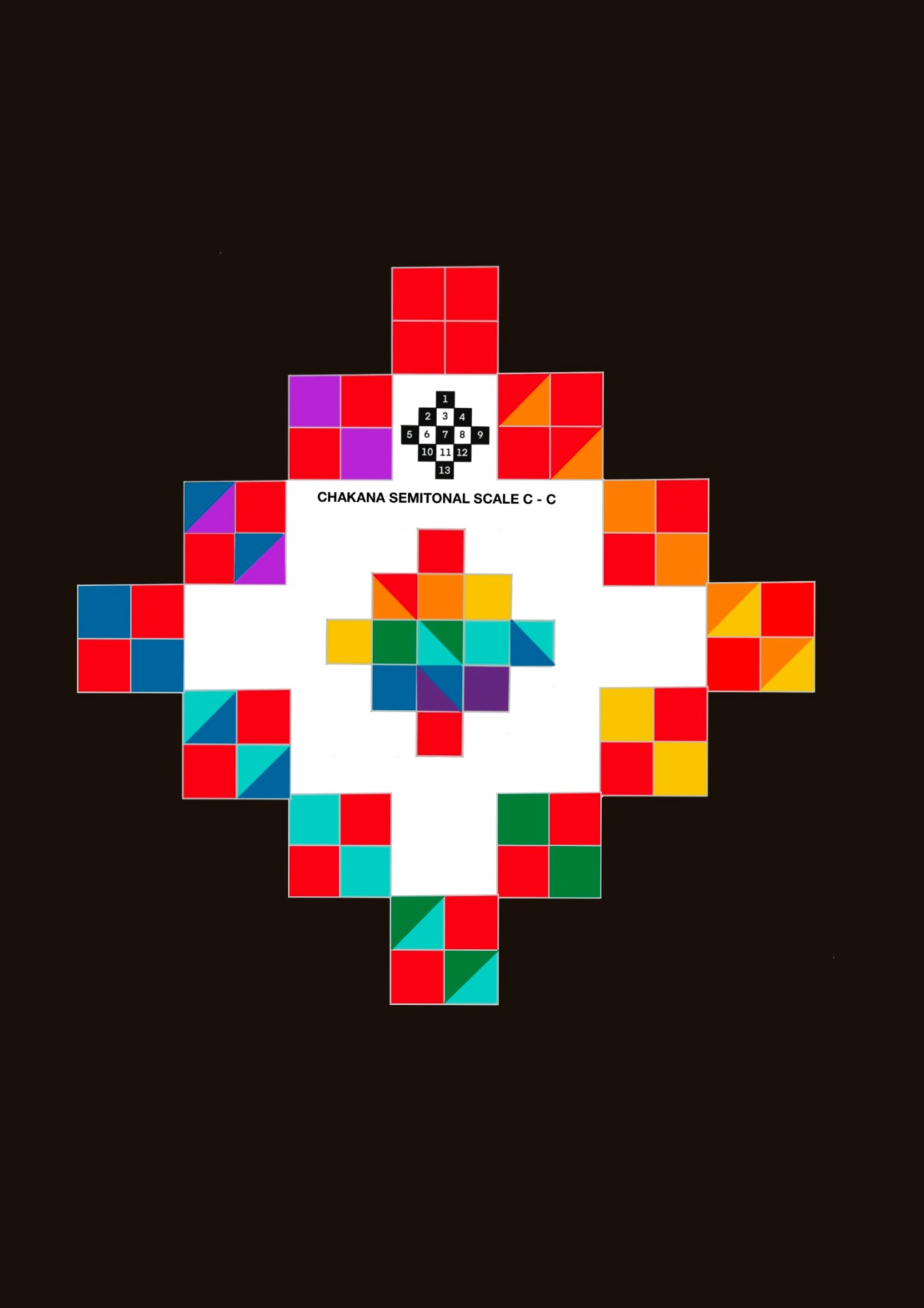 Thus, inspired by research made on mathematics in the ancient Andean geometry, and, the variables in the chromatic of the Wiphala symbol, the two musicians and researchers, César Aguilar Alcedo, a descendant of José Bernardo Alcedo, educator and composer of the Peruvian national anthem and author of the first book in America about music theory "Elementary Philosophy of Music" (1869), and Kurmi Milla Silva, grandson of the researcher and Irpiri, Architect Carlos Milla Villena, the discoverer of the Chakana in his now classic work The Genesis of the Andean Culture, have set out to solve the challenge of music notation, based on the visual perception and inspired by how the forefathers composed the ancient kilkas. This way Takilka was born, a musicographic exploration that weaves together the languages of musical sound and their graphic representation, to discover the iconic potential of geometry and color, from the Andean forefathers' ancestral symbolism. In these times of Inkarri, will the prophecy of the head that rejoins the body be fulfilled, and thus today, the knowledge transcends the past and tradition to project itself once more into the future ...